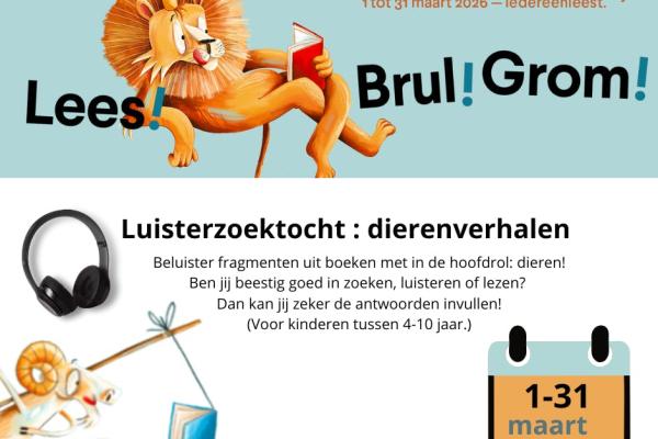 Luisterzoektocht dierenverhalen (doorlopend-jeugdboekenmaand) 28.02.2026, 08:00 - 31.03.2026, 18:00 Tijdens jeugdboekenmaand kan je de héle maand op luisterzoektocht gaan in onze bib. Beluister fragmenten uit boeken met...