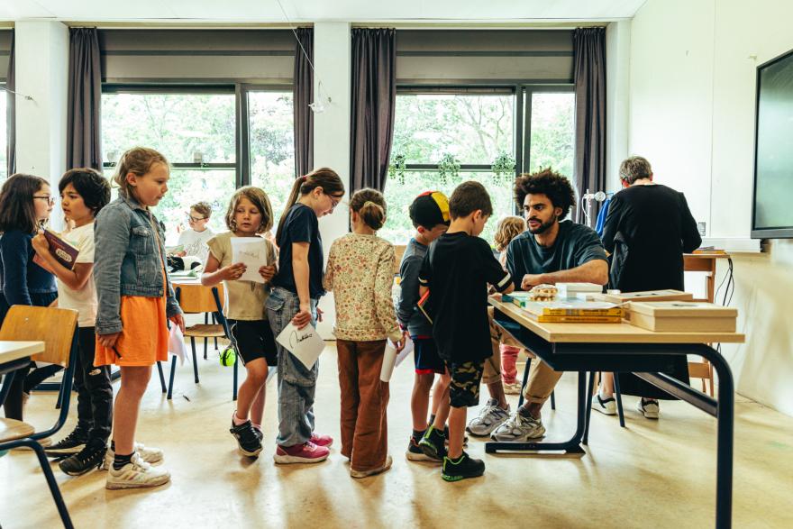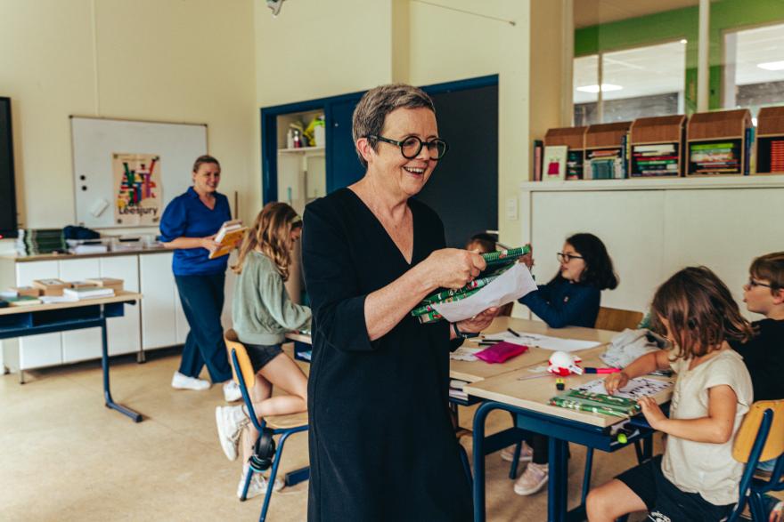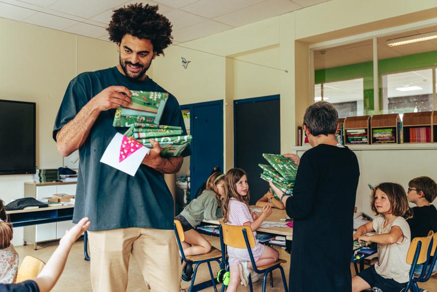 Elk kind kreeg een boek cadeau en de juf kreeg een aantal boeken voor de klasbib.