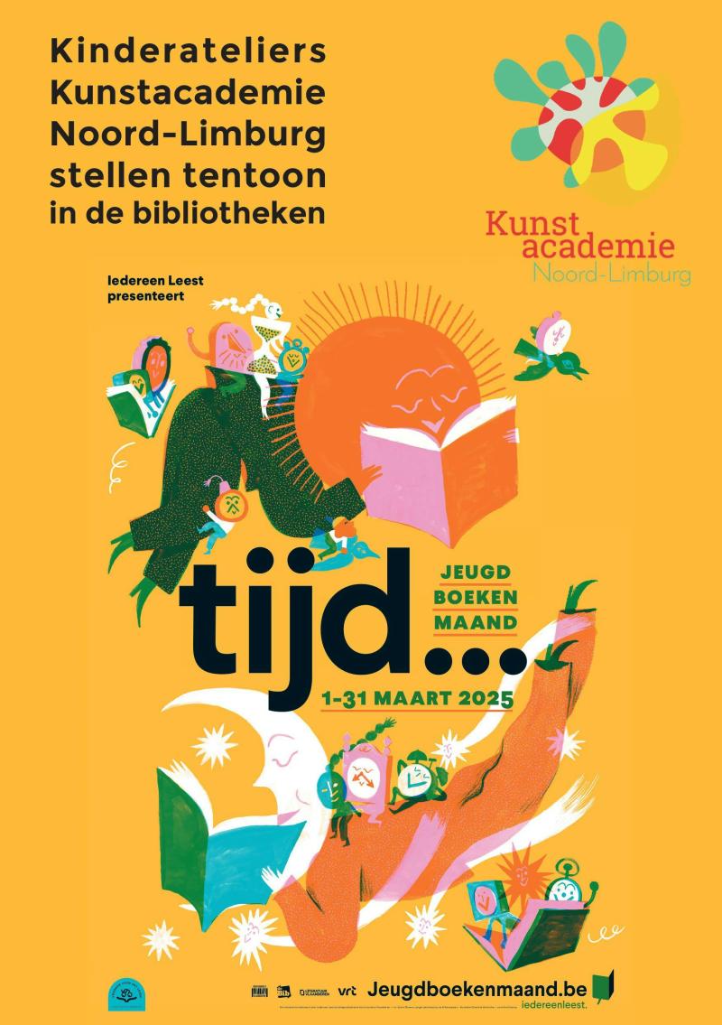 Ontdek tijdens Jeugdboekenmaand de werken van de leerlingen van Kunstacademie Noord-Limburg die in het teken staan van 'Tijd'! In deze verrassende en vrolijke groepstentoonstelling ontdek je 10 3D-slakjes, die de symboliek van traagheid versus snelheid vertegenwoordigen, en 30 A3-tekeningen waarvoor de leerlingen (van 9 tot 11 jaar) zelf een volledig kwartier volledig hebben stilgezeten!