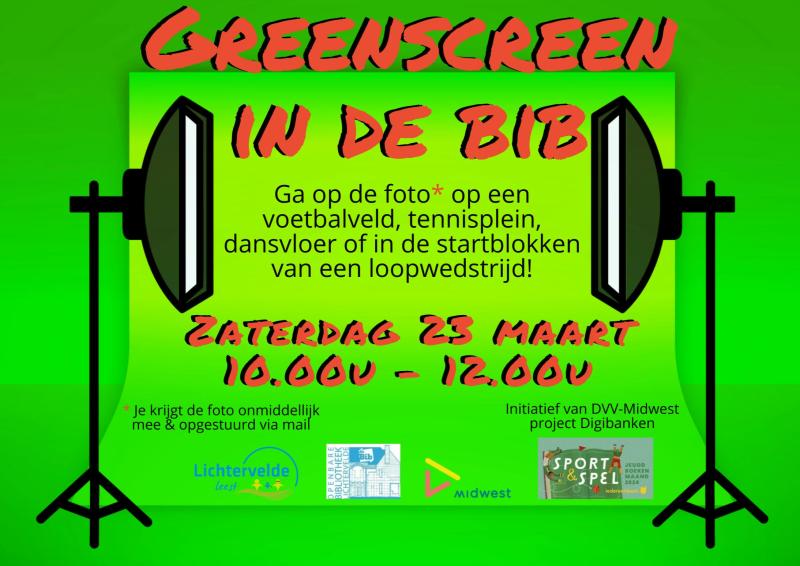 Op 23 maart slaan de digibanken van Midwest en de jeugdboekenmaand de handen in elkaar voor een toffe activiteit. Ze komen met een green screen naar de bib waarop je kan poseren alsof je op een sportveld staat: een voetbalveld, een tennisveld, een atletiekpiste, een dansvoer, ..... Je krijgt onmiddellijk de foto mee en je kan hem ook via email opgestuurd krijgen. Kom zeker eens langs tussen 10 en 12 uur.