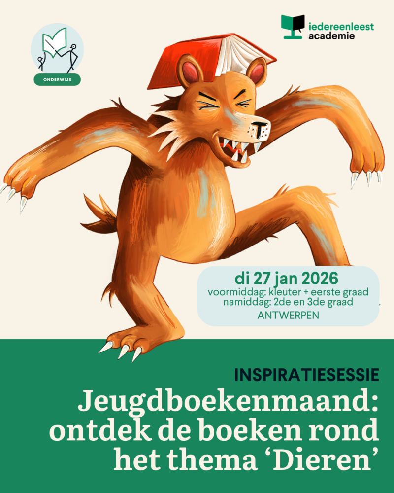 Deze inspiratiesessie dompelt je helemaal onder in het boekenaanbod van Jeugdboekenmaand. Je leert boeken rond het thema 'Dieren' kennen en leert hoe je dat boekenaanbod doelgericht kan inzetten in je klas of school. Aan het einde van de opleiding zit je vol ideeën om in je klas of school aan de slag te gaan.