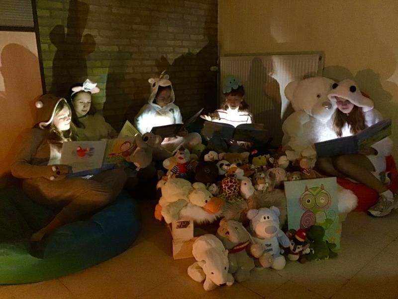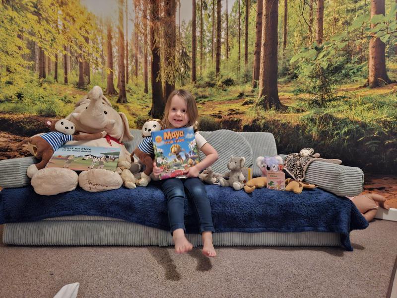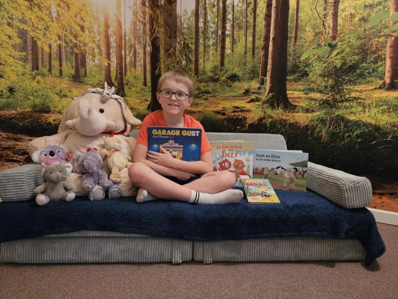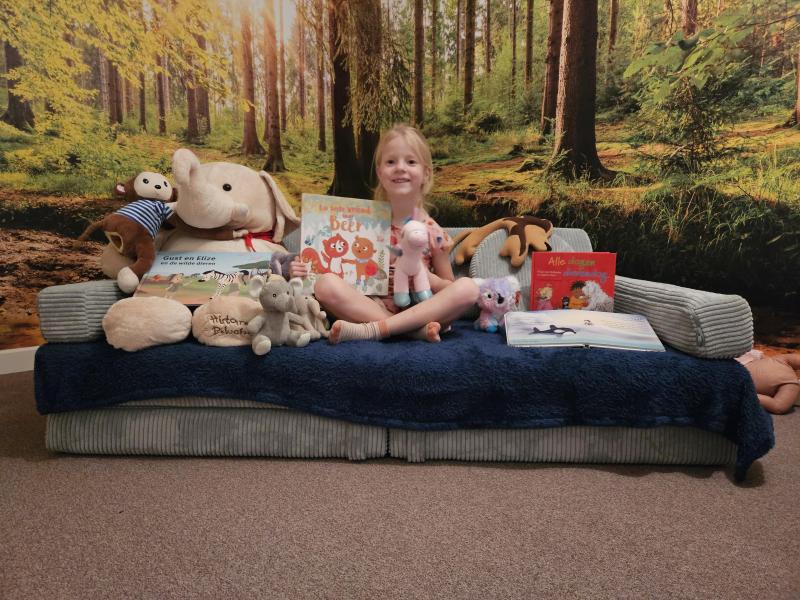Ik lees heel graag en heb voor deze foto alle dierenboekjes en -knuffels die we thuis hebben samengebracht in het 'dierenbos'.