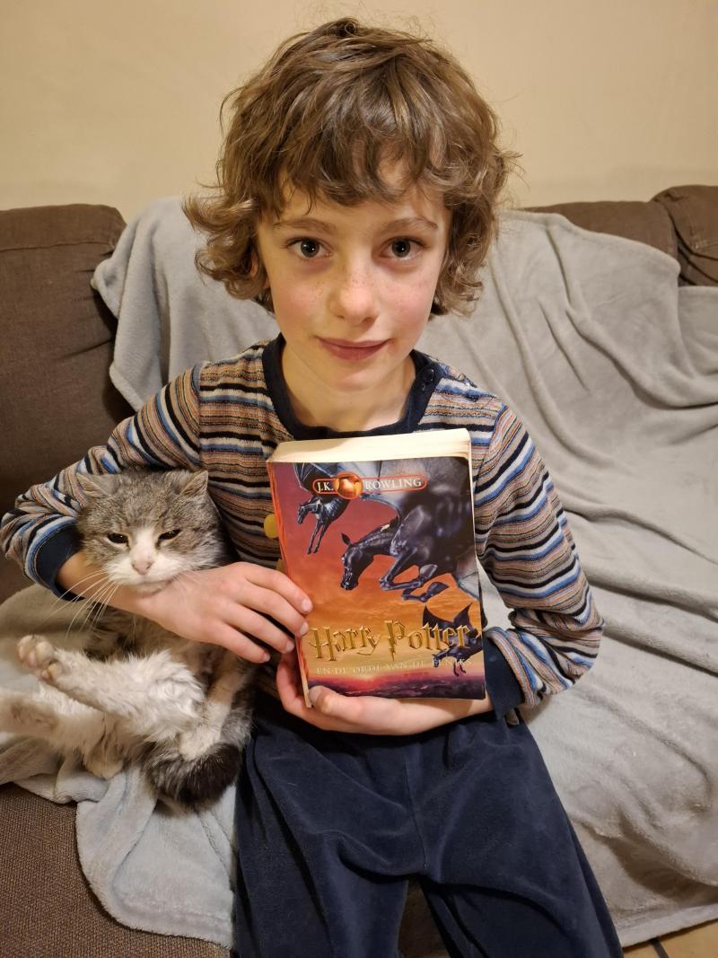 Siebe leest supergraag en waagt zich op zijn jonge leeftijd aan zijn eerste Harry Potterboek, met de hulp van mama en moemoe, terwijl onze 21jarige poes die alle belangrijke fasen in ons leven meemaakte (we noemen Ribbel onze "Bompi" haha) in de boekenkast op zijn matje ligt. Die twee en een boek, een echt bloedbroederschap 😍 Hier denkt Ribbel er het zijne van, de woeshi is veel gewoon met het jeugdige geweld in huis 😄