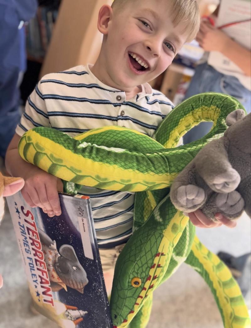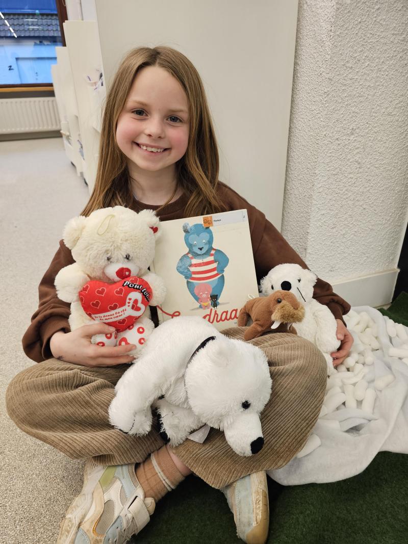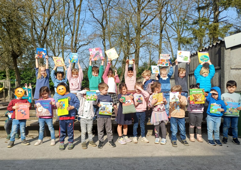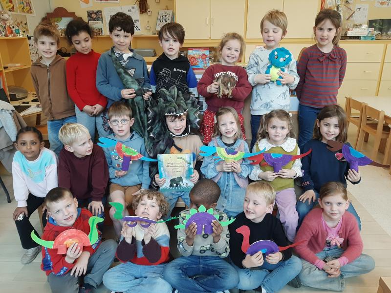 We zien de kleuters van de kikkerklas (2e en 3e kleuterklas) op de foto met in het midden het 'boekenbeest'. We werken enkele weken rond 'boeken'. Daarbij heeft het boekenbeest telkens een nieuw boek bij. Zo leren we verschillende soorten boeken kennen en beleven we samen veel boekenplezier!