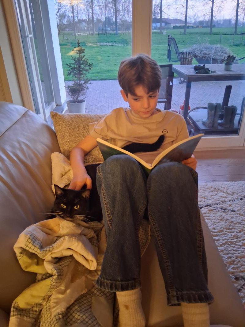 Gust leest in zijn boek ter voorbereiding van een boekbesoreking samen met kattin Socks(9 maanden)
