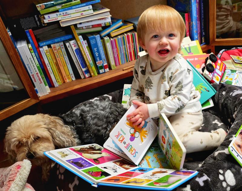 Tuur leest samen een boek met zijn hondje Lilly.