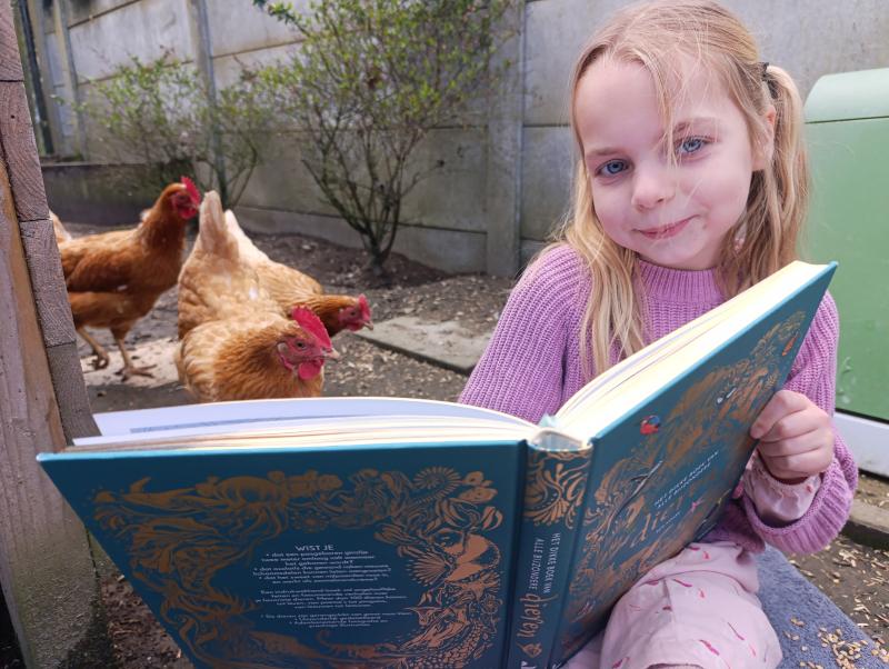 Lili was aan het voorlezen uit 'Het dikke boek van alle bijzondere dieren' voor onze meest bijzondere diertjes; onze drie kippen. De kipjes heten; Noor, Isa en Keelin.