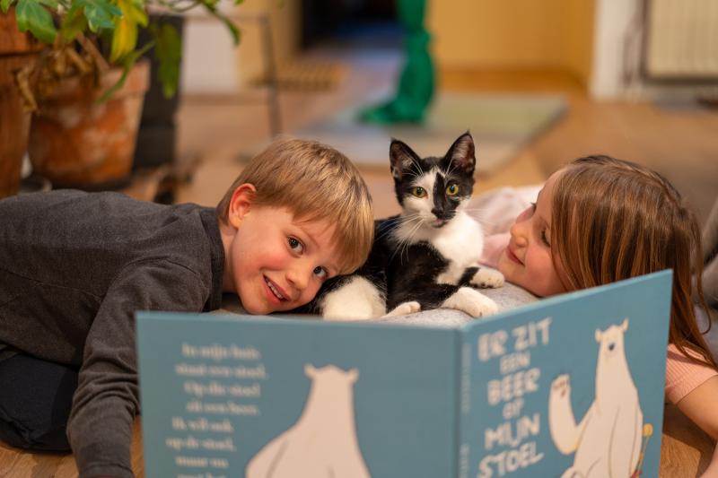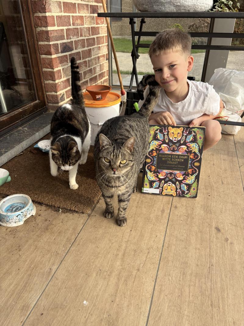 Mijn broer en ik tonen ons favoriete boekje aan nello onze poes. "Er zit een beer op mijn stoel" Nello leest graag boekjes over muizen en ze was niet bang van de beer. Groetjes Louise en Magnus