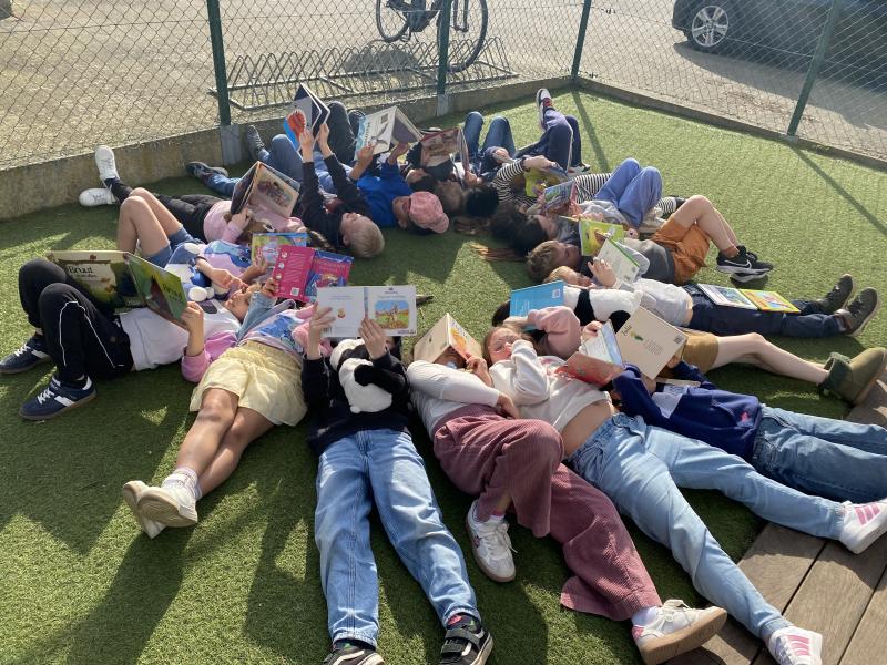 Op de foto zie je de groep leerlingen die elke week 3 lesuren Taal en Communicatie (2°jaar secundair onderwijs) volgt. In deze uren gaan we enthousiast aan de slag met taal, poëzie, lezen, spreken... (in 3 talen: Nederlands, Engels, Frans). We doen dat het liefste op een creatieve manier met een goed onderbouwde (theoretische) achtergrond. Om deze optie te kiezen is het geen voorwaarde om een echte krak te zijn in taal, je hebt enkel passie voor, nieuwsgierigheid naar en liefde voor taal en talen nodig. De leerlingen zagen het meteen zitten om aan deze wedstrijd deel te nemen en het idee van hoe de foto er moest uitzien komt ook volledig van hen zelf. Ze willen een knusse leesplek tonen waar het boek en het verhaal hen verwondert en boeit. (De leerlingen heten (van links naar rechts) Oona, Phebe, Niene, Marthe, Anaïs. We vonden het fijner om ze als groep te vernoemen bij de foto en niet met hun namen.)