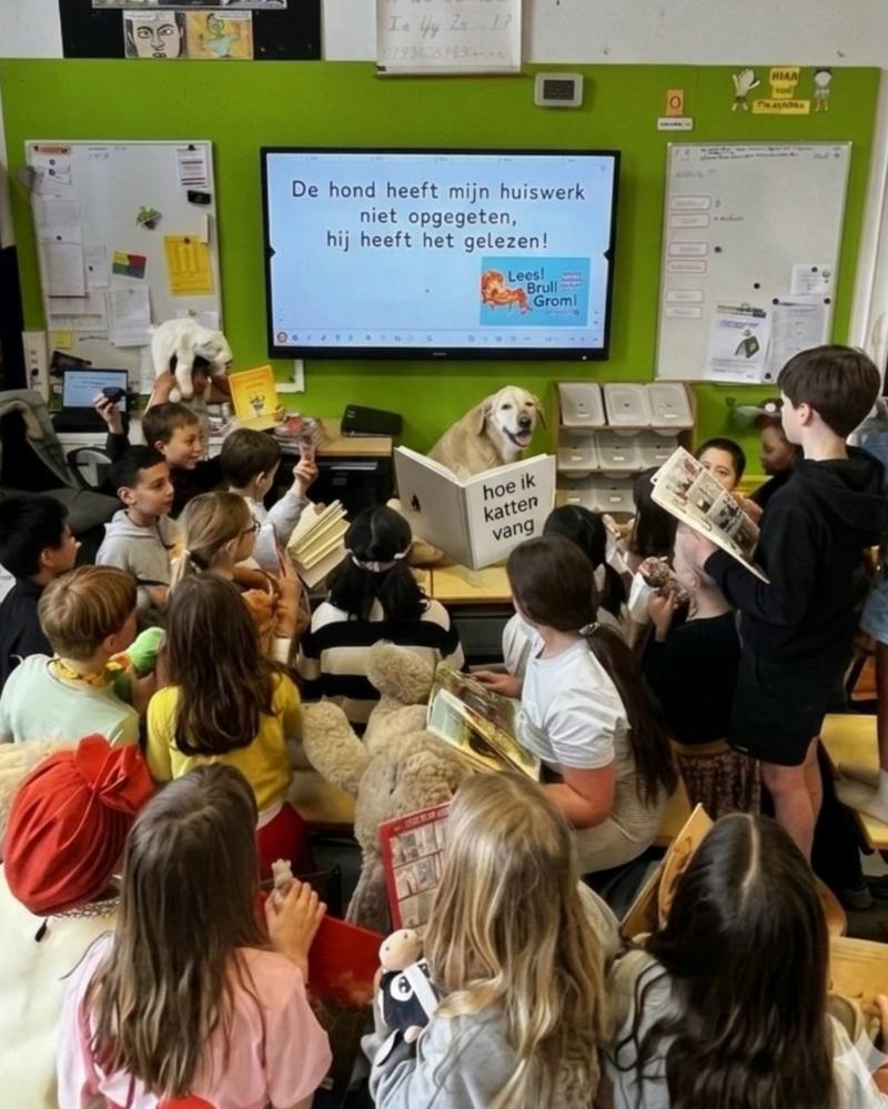 Onze voorleeshond kwam vandaag weer een boek voorlezen (Hoe vang ik een kat). Gelukkig hadden de kinderen van 3B ook nog een eigen boek om in te lezen.