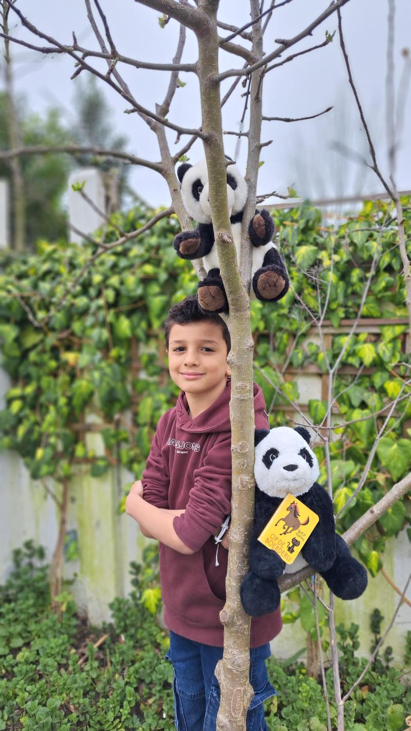 In deze tuin gebeurt iets bijzonders: twee panda’s hebben een boom uitgekozen als hun geheime plek. De jongen staat er rustig bij, alsof hij hun beste vriend is. Misschien zijn het wel magische panda’s die alleen zichtbaar zijn voor hem… en begint hier een spannend avontuur! 🌿🐼