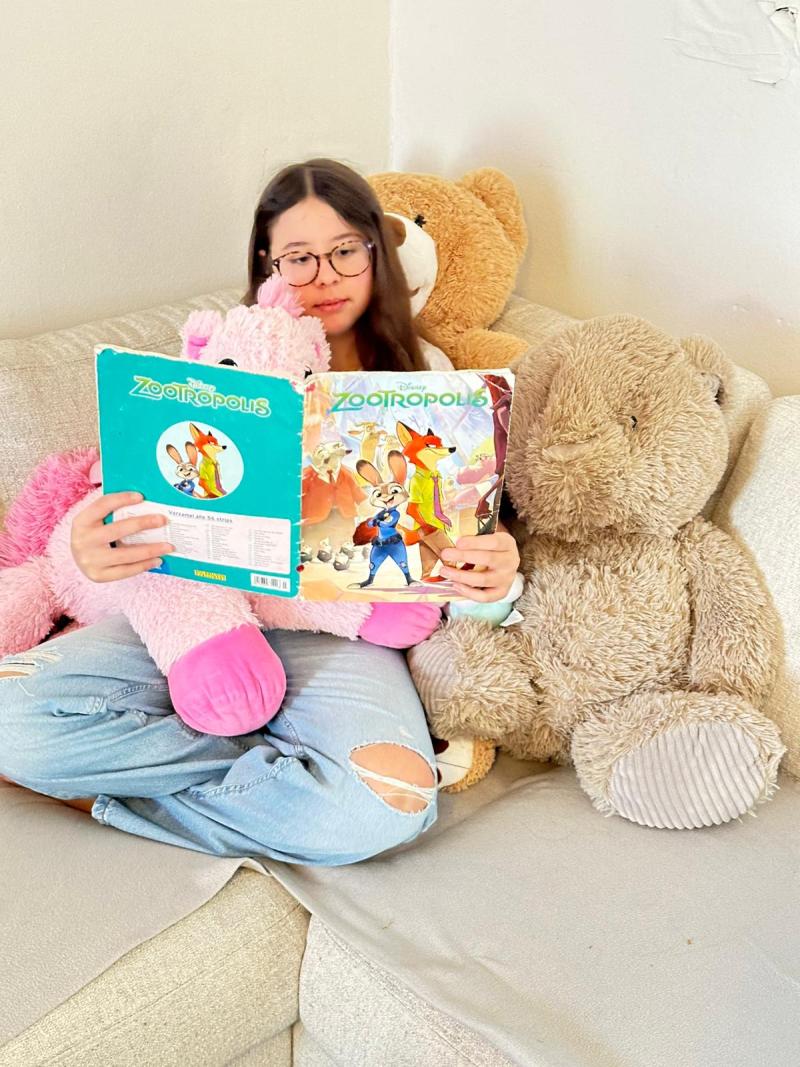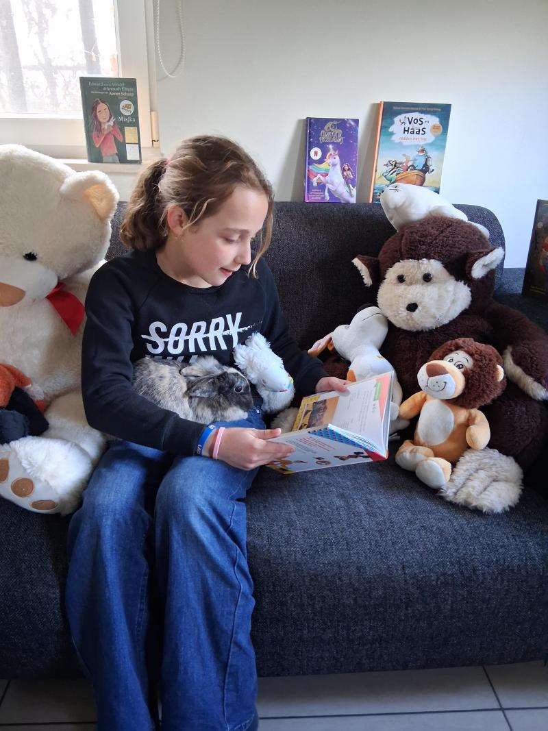 Ik lees voor aan mijn konijn, omringd door allemaal dierenknuffels en dierenboeken.