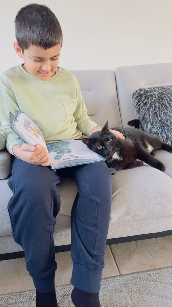 Zodra ik een boekje lees, springt hij op mijn schoot.