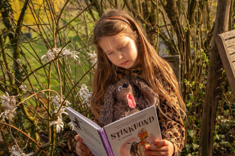 De zon straalt, de pagina’s fluisteren verhalen, en op haar schoot zit haar lievelingsknuffel, Stinkhond. Samen verdwalen ze in de wereld van Stinkhond. Want de mooiste verhalen lees je nooit alleen.