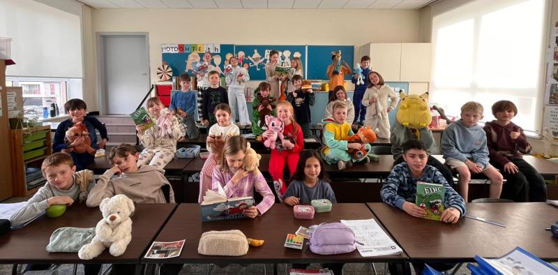 Op de foto zie je alle leerlingen van het vierde leerjaar van VBS De Bijenkorf in hun pyjama en met hun dierenknuffels op pyjamadag. Enkele leerlingen namen hun exemplaar van 'Project D.I.N.O.' en 'Operatie T.O.I.L.E.T.' mee voor de foto!
