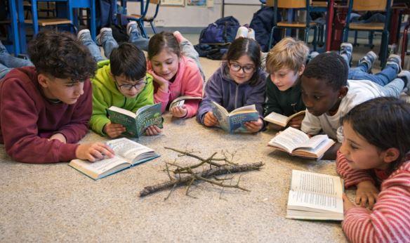 Je ziet een aantal kinderen die een boek lezen. In het midden lopen onze wandelende takken.