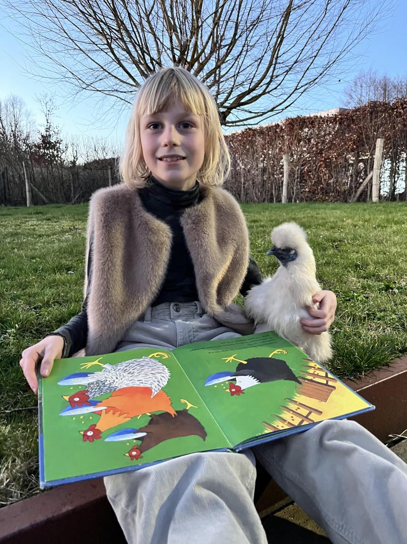 Odille leest aan zijn huisdier, baba de kip voor over haar verre voorouders, de dino. Het leukste leeskwartiertje vanuit zij boomhut.