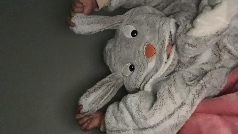 Annelien het konijn, tegenwoordig haar favoriete avondtrui. Lekker warm om in de zetel voor de tv te kruipen