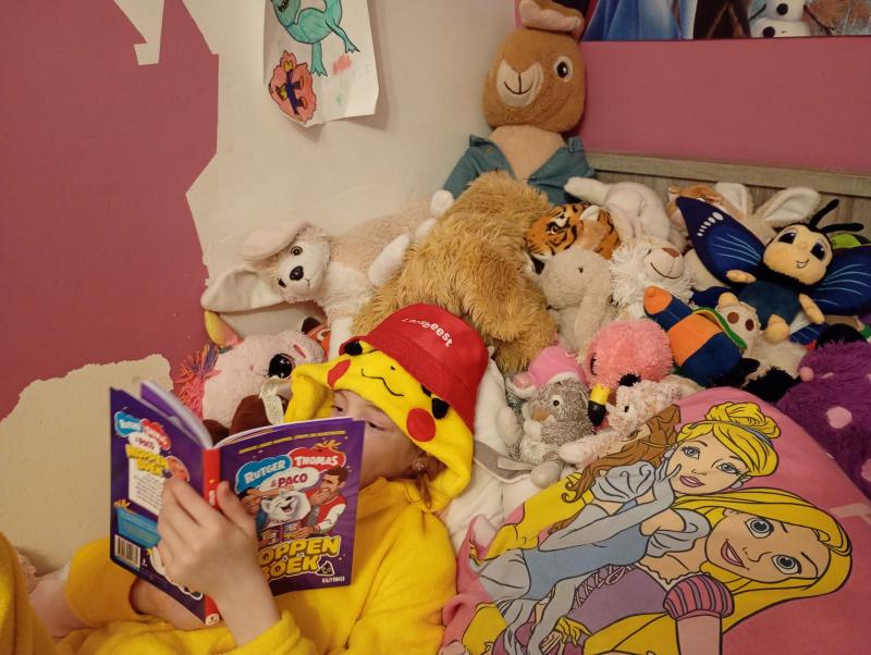 Ons 'leesbeest' leest mopjes voor aan haar beestenboel in bed