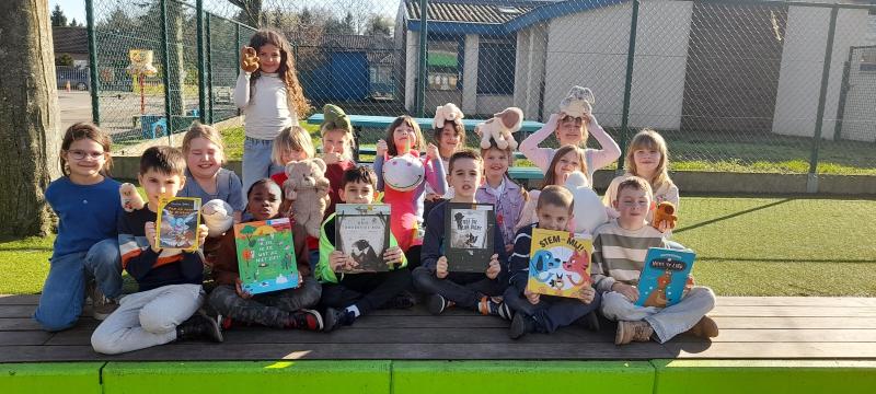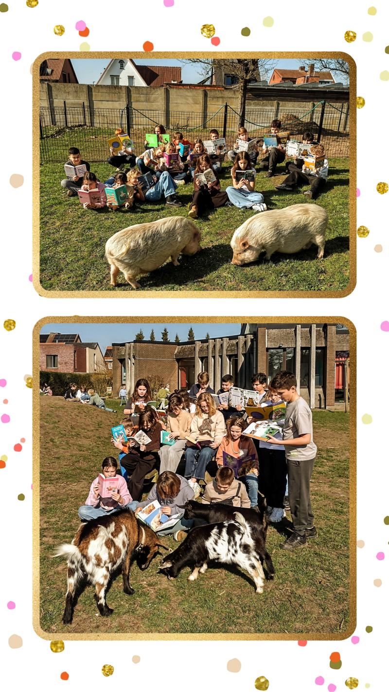 Wij zijn het 5e leerjaar van het groenste schooltje in Wommelgem. We hebben heel wat dieren op onze school: cavia's, konijnen, geiten en varkentjes. Op de foto's zie je ons met de boeken over -al dan niet bestaande- dieren uit onze klasbib én enkele van de dierenvriendjes op onze school. Ook zij zijn fan van het thema van de jeugdboekenmaand!