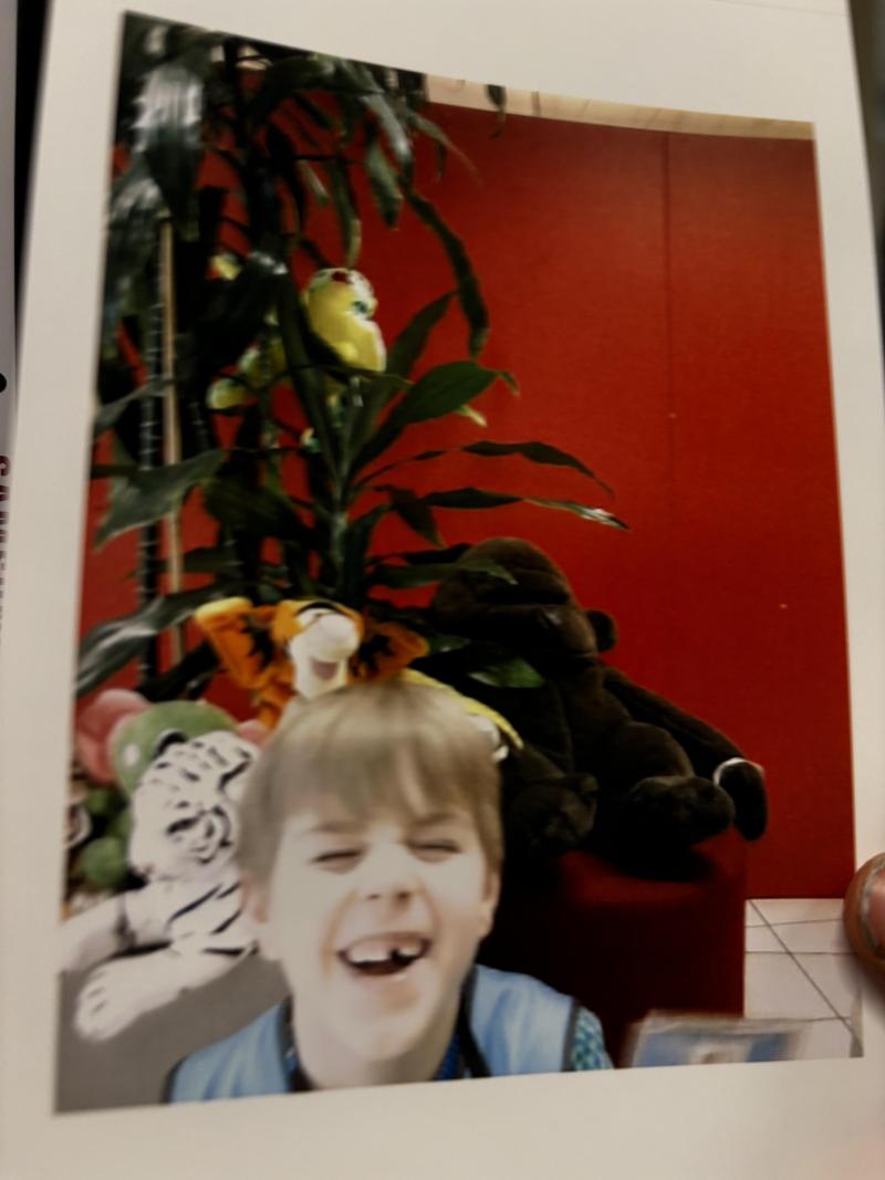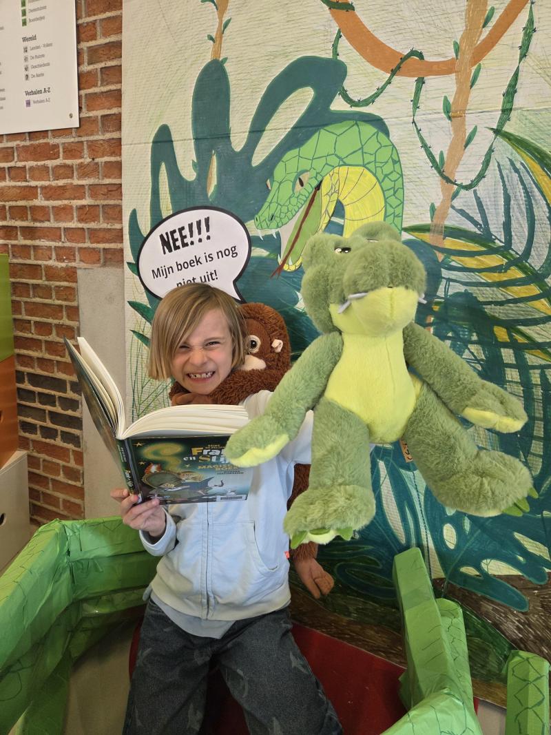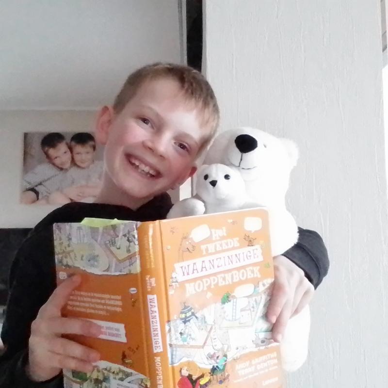Ik Mathis Lecomte die samen met mijn knuffel in het waanzinnige moppenboek moppen leest.