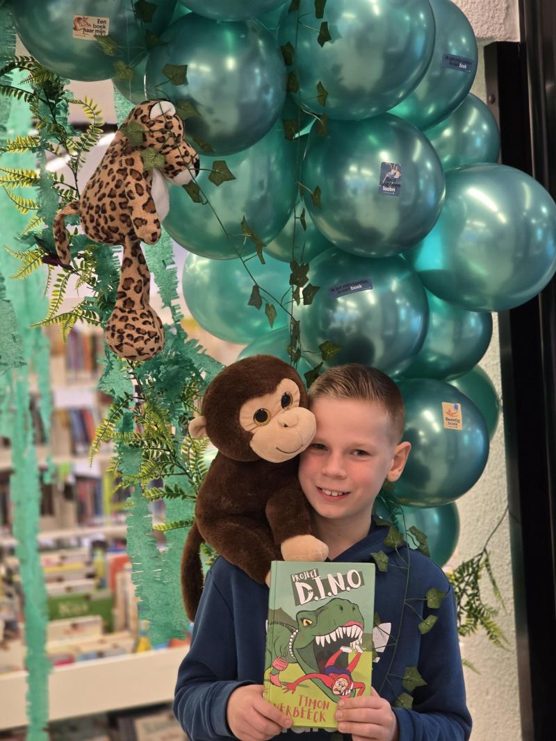 Léon poseert in de wilde jungle van de bibliotheek met zijn vriend de aap, die nieuwsgierig is naar het boek van Timon...
