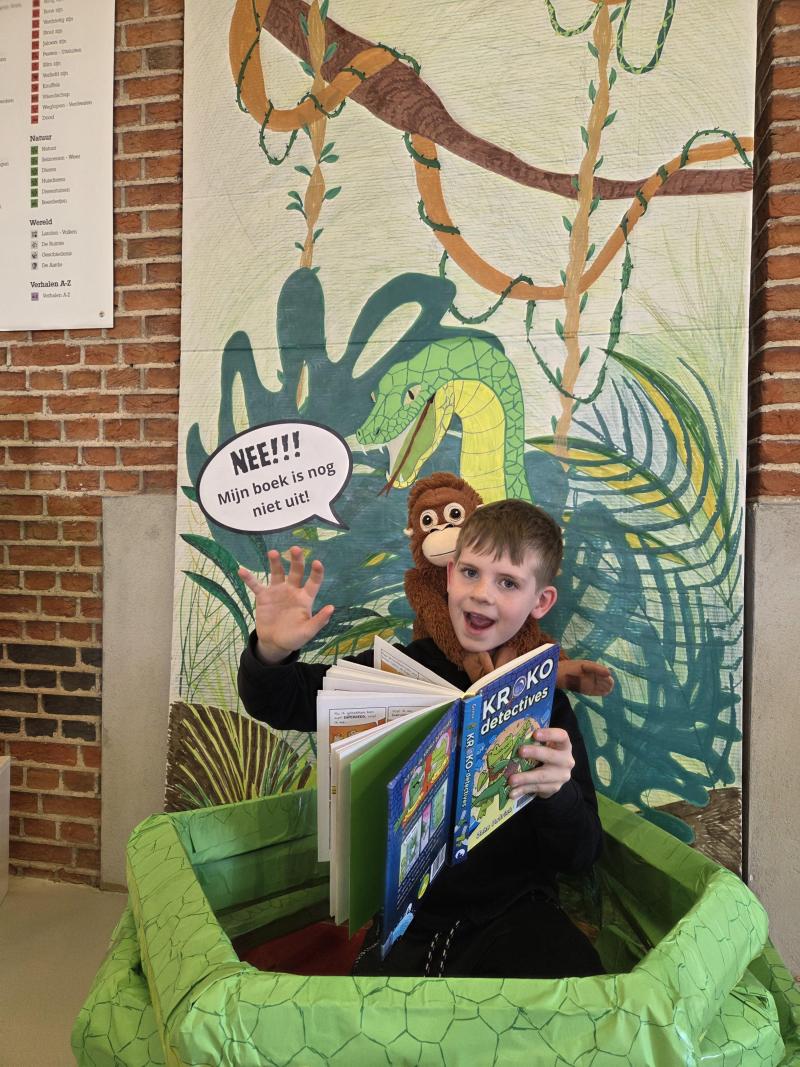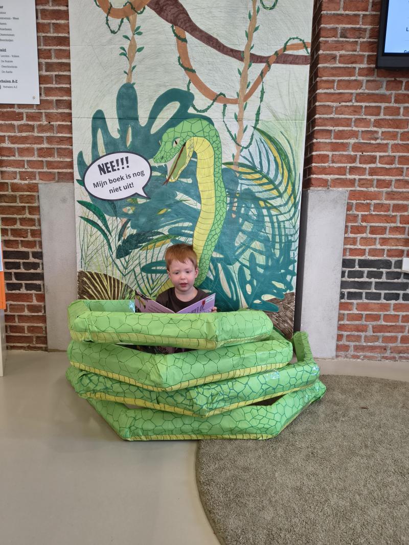 Lucas is het aan het lezen met de knuffel van Punch en wordt bijna gewurgd door de slang, ahhhh