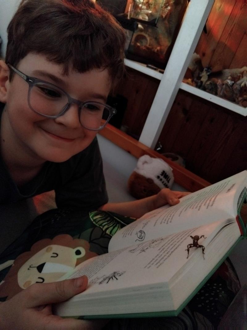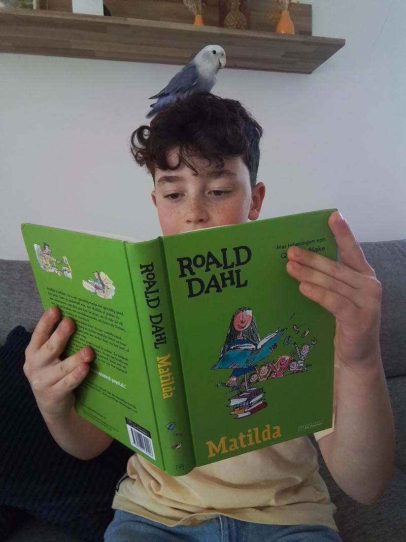 Mijn tam vogeltje en ik lezen een bekend boek van Roald Dahl