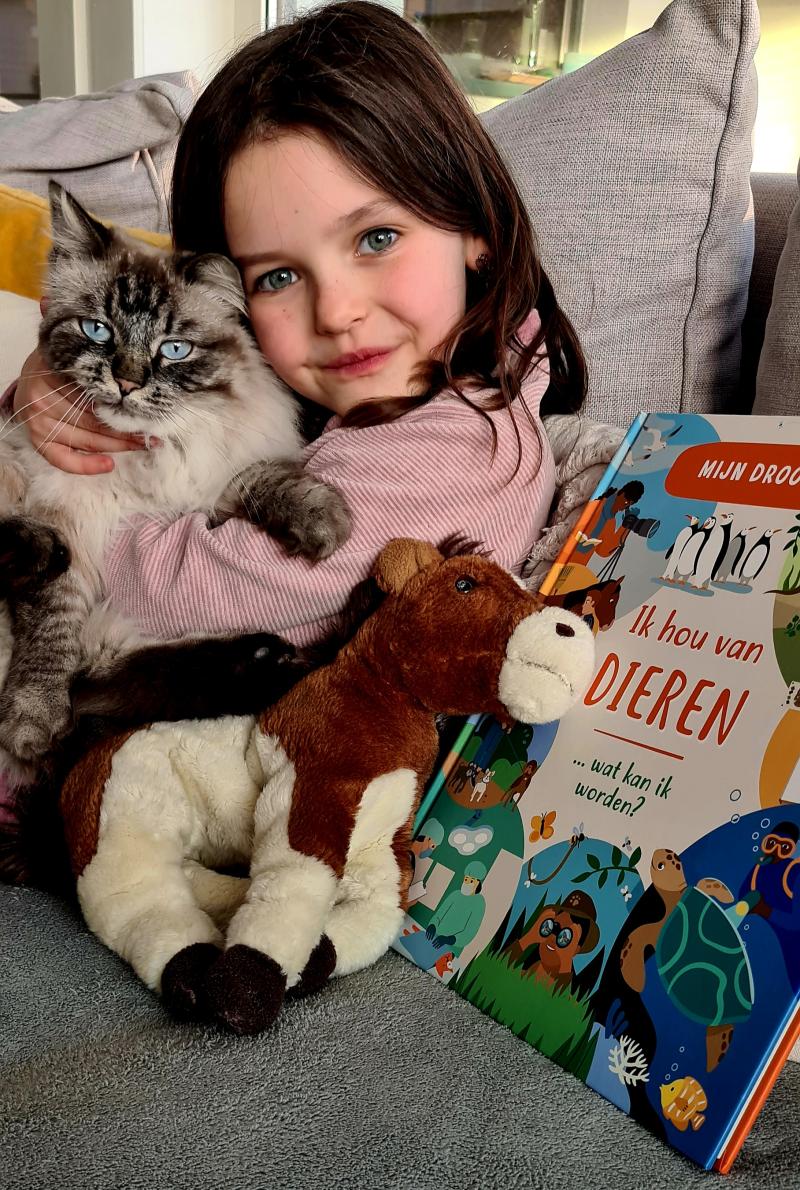 Mila met haar huisdier Indy en paartje er bij. Samen met haar boek 'ik hou van dieren!'