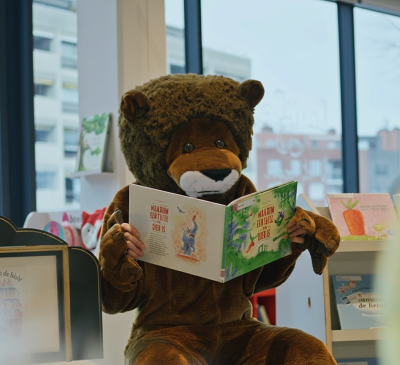 Onze enthousiaste Bibmedewerker Viktor kruipt maar wát graag in de huid van een sterke leeuw om voor te lezen aan onze leners! Hij leest, hij brult en hij grrrrromt!