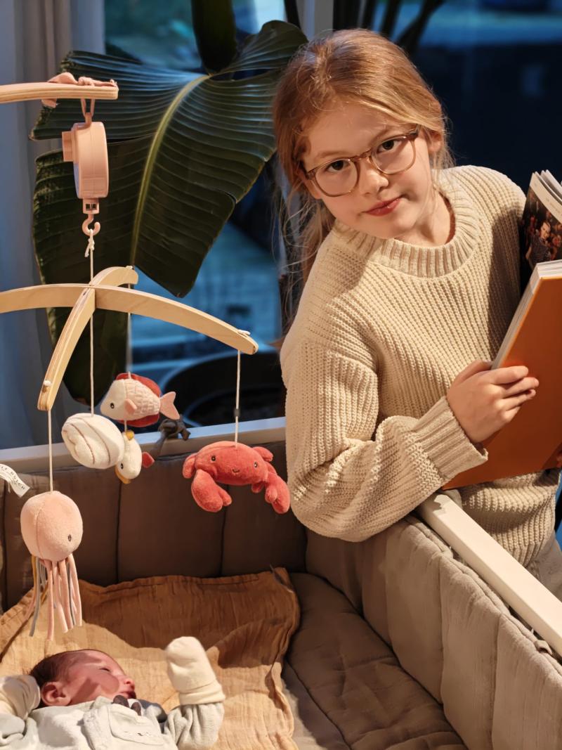 Mijn zus die een paar weken oud is en haar krabben en vissen, en ik heb een decoratieboek vast van mijn plusmama. Mijn boek die ik nu lees over panda's ligt boven in mijn kamer.