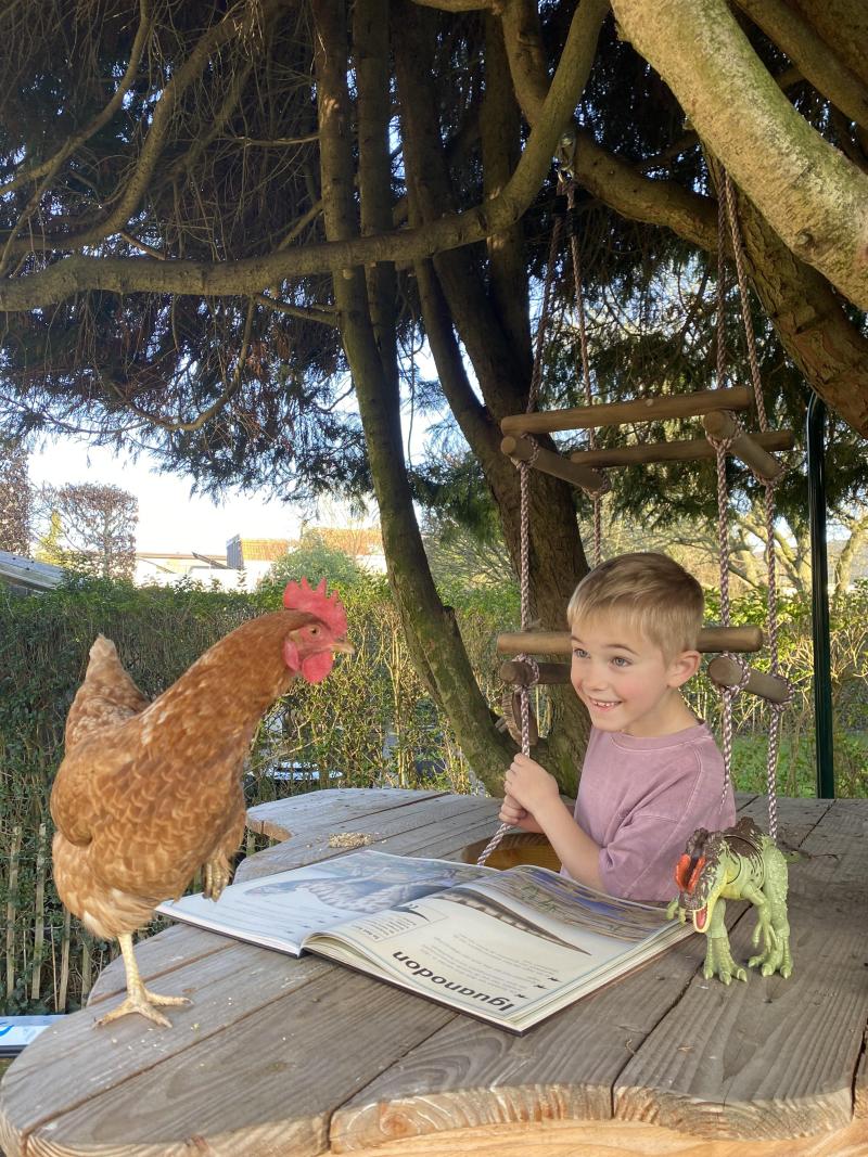 Odille leest aan zijn huisdier, baba de kip voor over haar verre voorouders, de dino. Het leukste leeskwartiertje vanuit zij boomhut.
