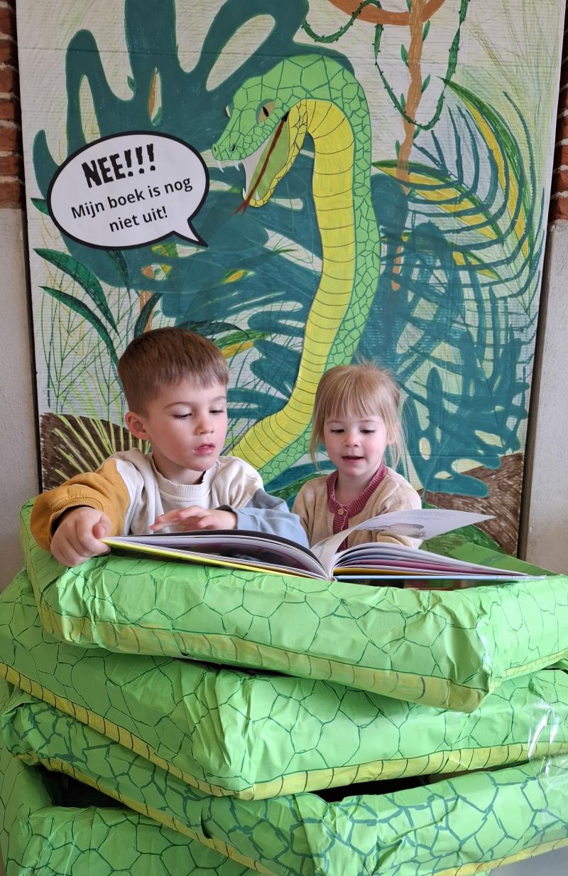 Broer en zus proberen snel hun boek uit te lezen voor de slang hun opeet!