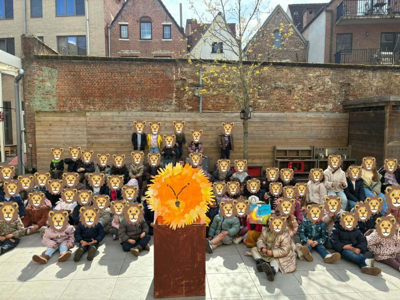 Met heel de kleuterschool knutselden we een grote leeuw. Alle klassen maakten een deel van de leeuw.