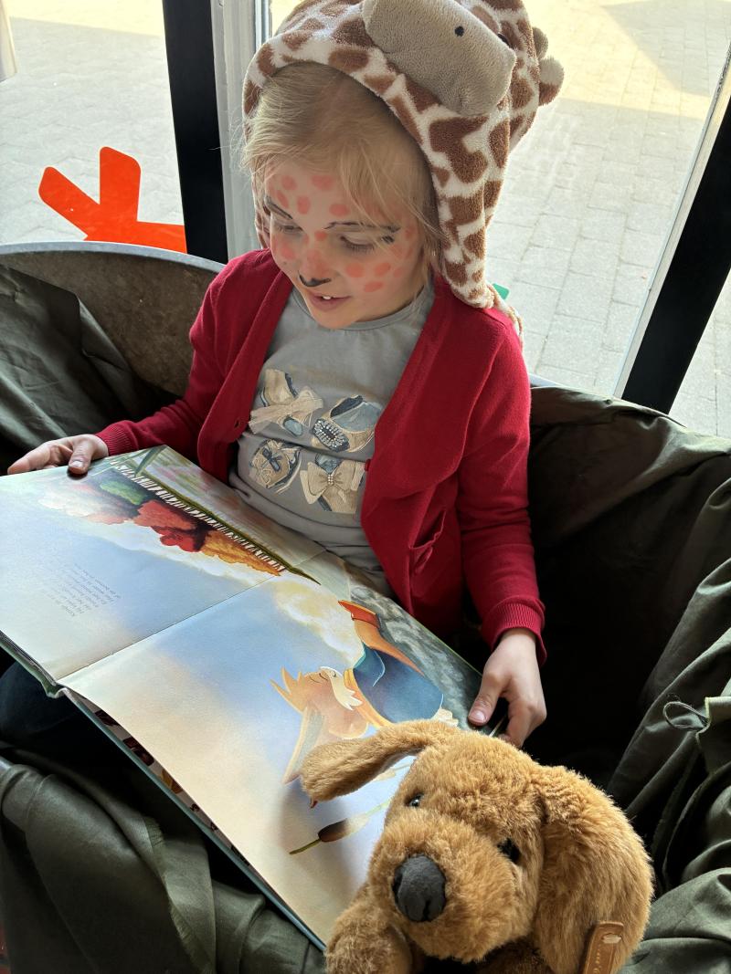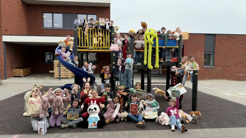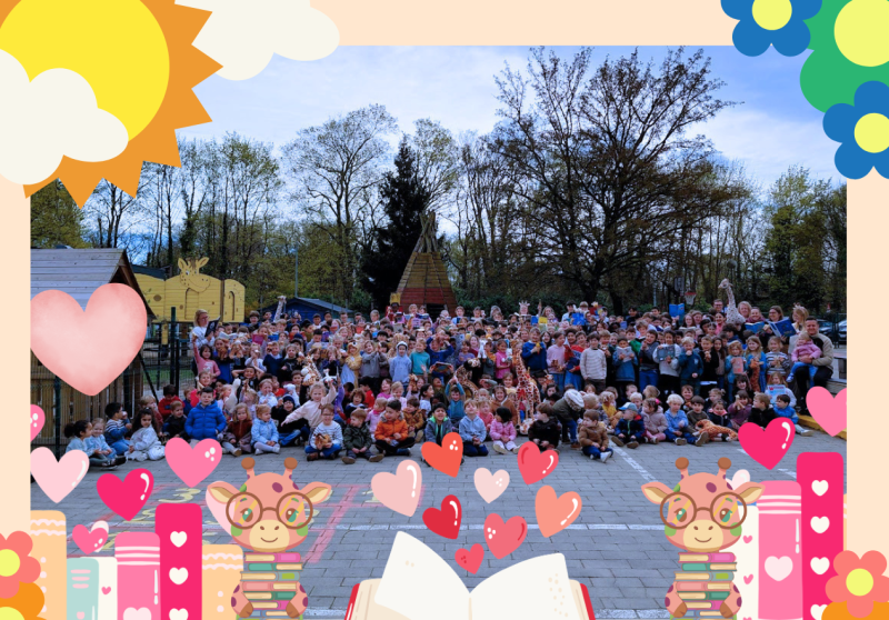En uiteraard kon onze giraf niet ontbreken! Op onze school staat de giraf centraal, het landdier met het grootste hart! Instapklas tot en met 6de leerjaar staan hier samen op de foto met talrijke girafjes en leuke boeken om samen te lezen, voor te lezen en te luisteren. Samen dragen we iedere dag zorg voor elkaar!