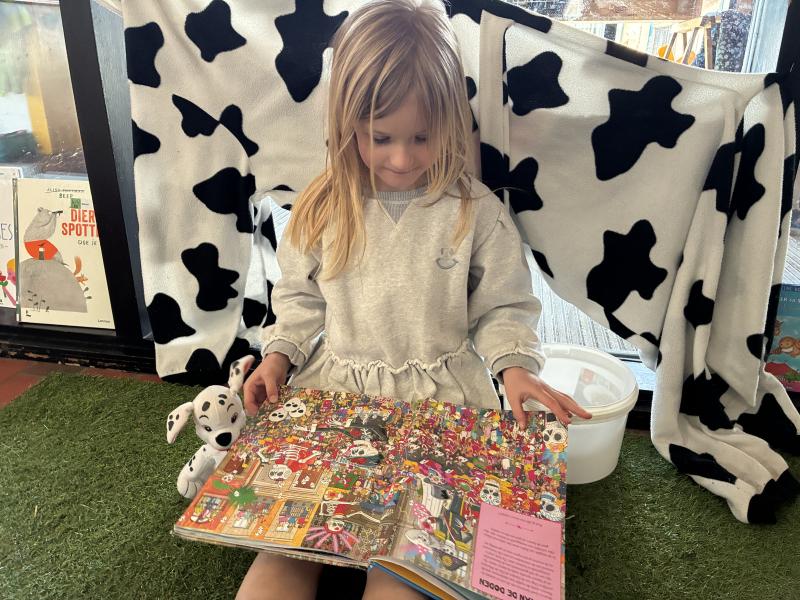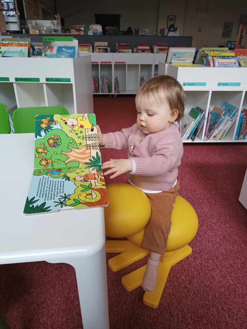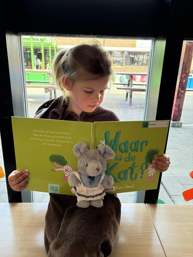 Ida op een kuikentje bumba aan het lezen na het voorleesmomentje 'de vertelkat'
