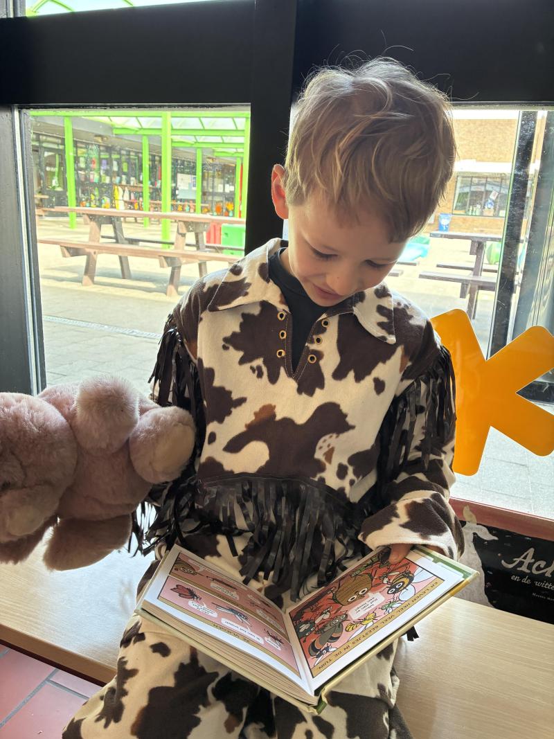 Tijdens de jeugdboekenmaand werd de gang bij ons op school omgetoverd tot een boerderij. Tijdens de speeltijden mogen we boekjes lezen en opdrachten doen. Ik zit bij de koe in weide op het gras een boekje te lezen. Mijn knuffel kijkt graag mee.