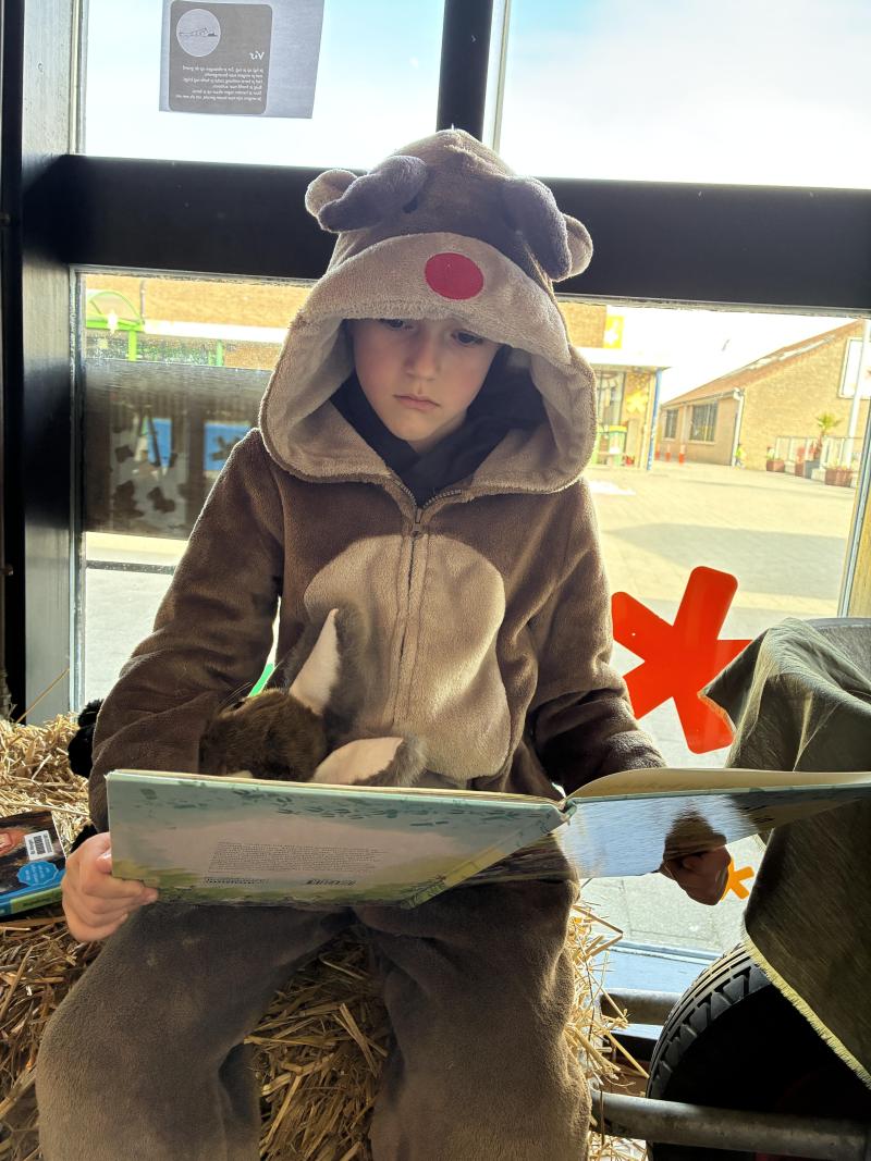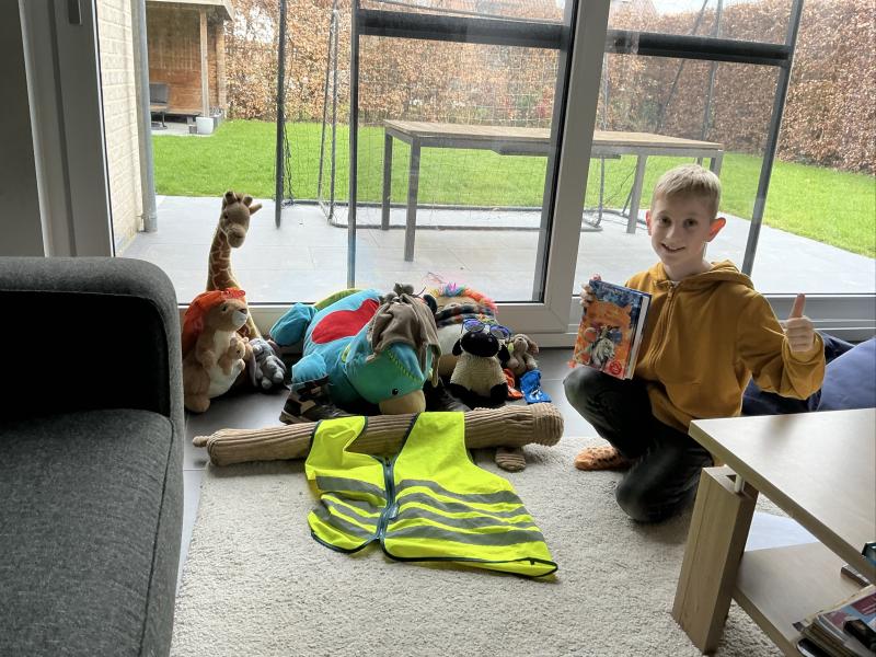 Vandaag kregen we de opdracht om verkleed als dier naar school te komen. Als we met meer dan 100 verklede kinderen waren, kregen we een puzzelstukje. Onze puzzel is bijna klaar! Nog enkele opdrachten. Ik vond het heel gezellig om als stier naar school te gaan. Gezellig lezen in de gang met een knuffel. Wat fijn!