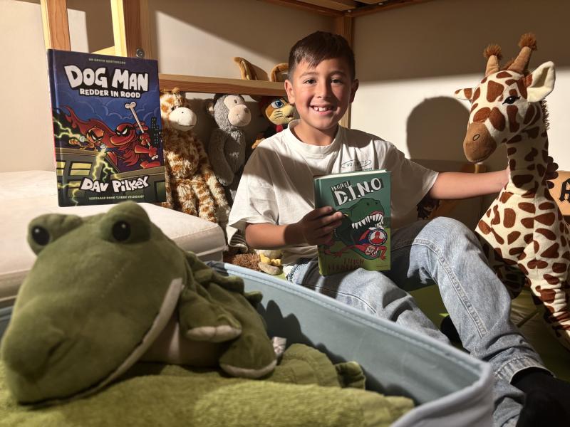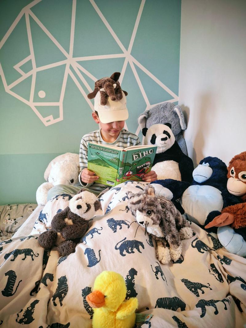 Boekenwurm Arthur vind je elke avond in zijn bed vol knuffels en met een boek in zijn handen. Op de foto zie je hem met een van zijn favoriete boeken. Humoristische boeken zijn het favoriete genre van de altijd vrolijke Arthur!