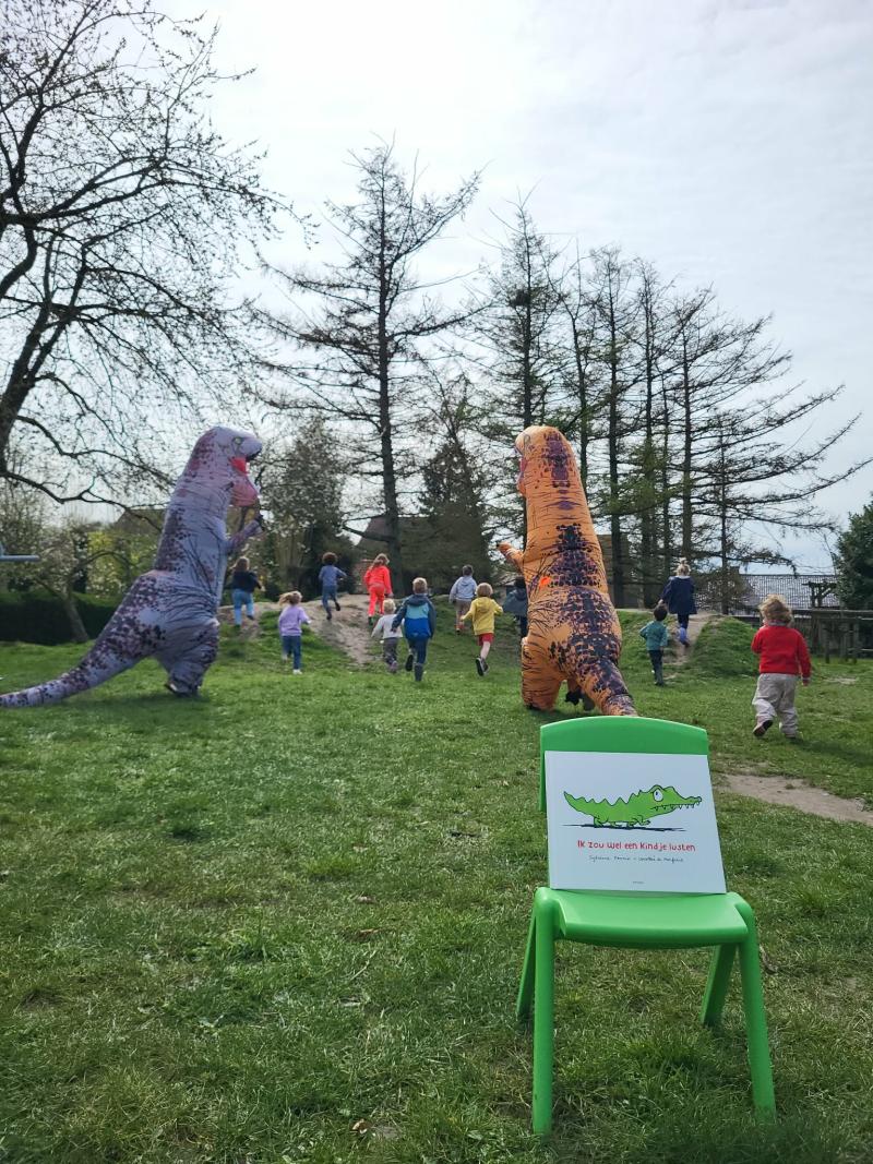 Samen met de kinderen gingen ze op dinojacht: rennen, lachen en vooral veel leesplezier! Want zeg nu zelf… een verhaal wordt toch extra leuk als de juf er zélf in meespeelt?