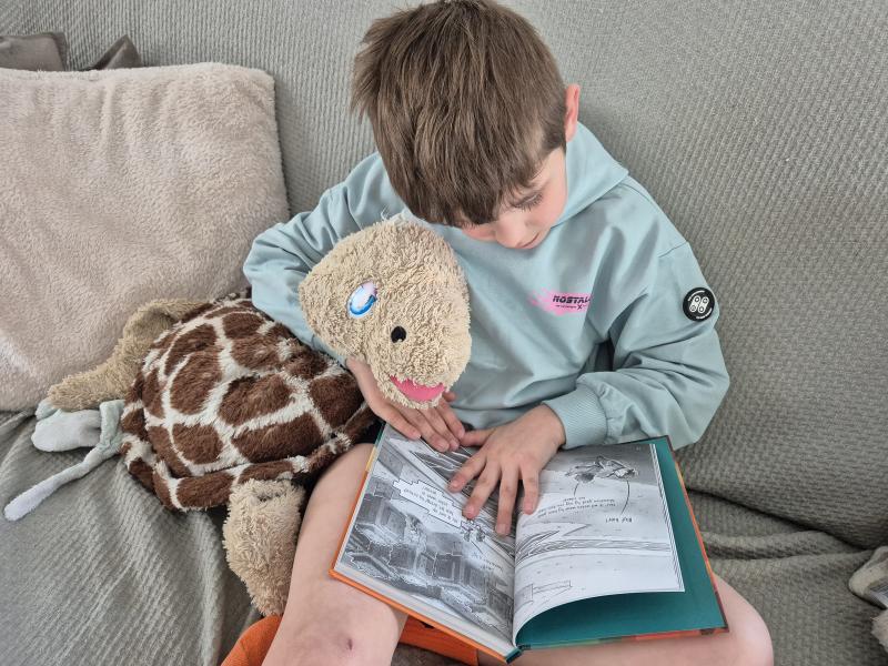 Robbe leest na school samen met schilpie zijn boek dat zus zorgvuldig voor hem uitkomst!