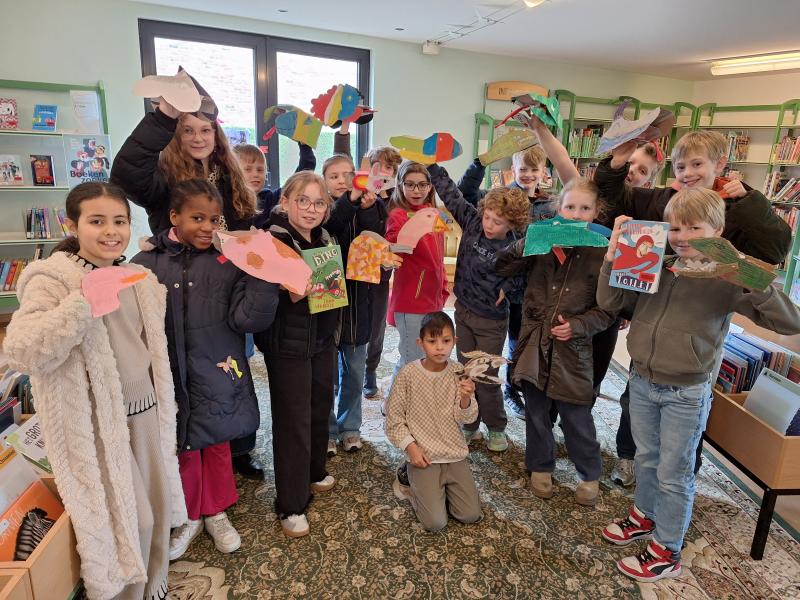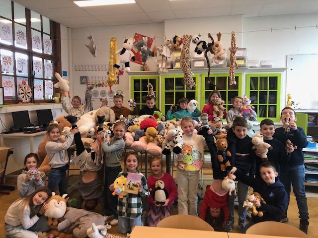 De giraffenklas (2de leerjaar) is helemaal ondersteboven van de jeugdboekenmaand. Samen met hun juf werkten ze rond het verhaal "Alles op zijn kop" en nog vele andere dierenverhalen. Deze enthousiaste bende verzamelde alle dierenknuffels die ze maar konden vinden om op de foto te gaan. Sommige kinderen waren er zelfs helemaal ondersteboven van. Lezen is een feest en het gaat nog beter met een knuffelbeest.