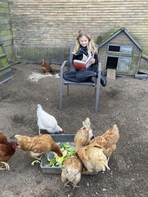 De kippen van haar grootouders hebben er evenzeer van genoten om de luisteren naar een mooi verhaaltje van Flappie het konijn.