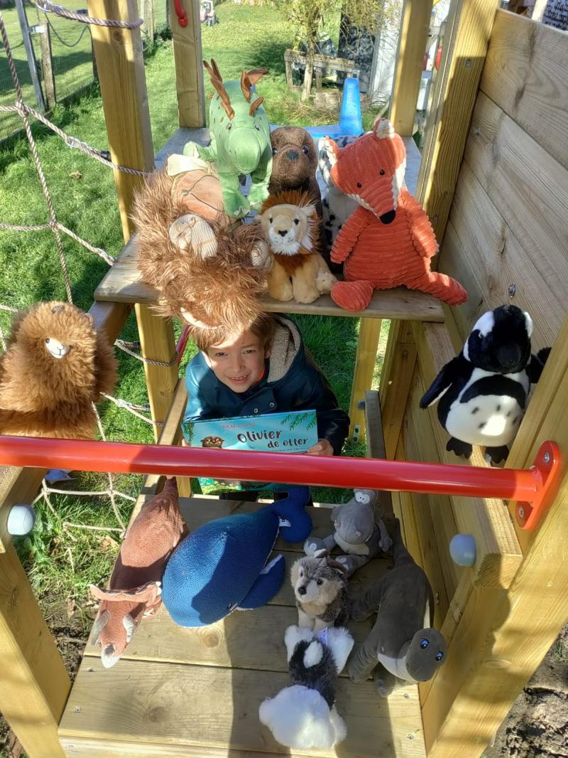Bran leest in zijn klimtoren, omringd over zijn knuffels over het leven van Olivier de otter.