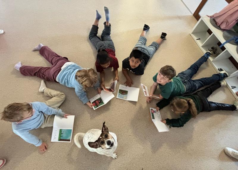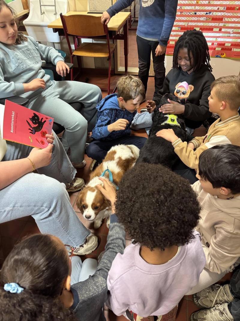 De klas vindt kijken en lezen in boekjes heel leuk, maar als we dat kunnen doen voor Cléo de hond is dat nog veel leuker! Zij hoort de verhaaltjes heel graag en is zot van voorgelezen worden!