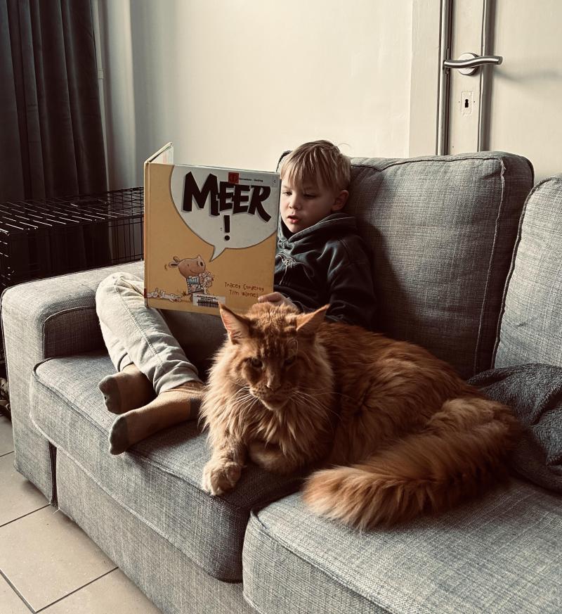 Jonas en Tazman de kat. Jonas leest voor aan Tazman uit MEER! van Tracey Corderoy, Tim Warnes. Tazman ligt dicht bij Jonas en houdt van knuffels. Schattig he!