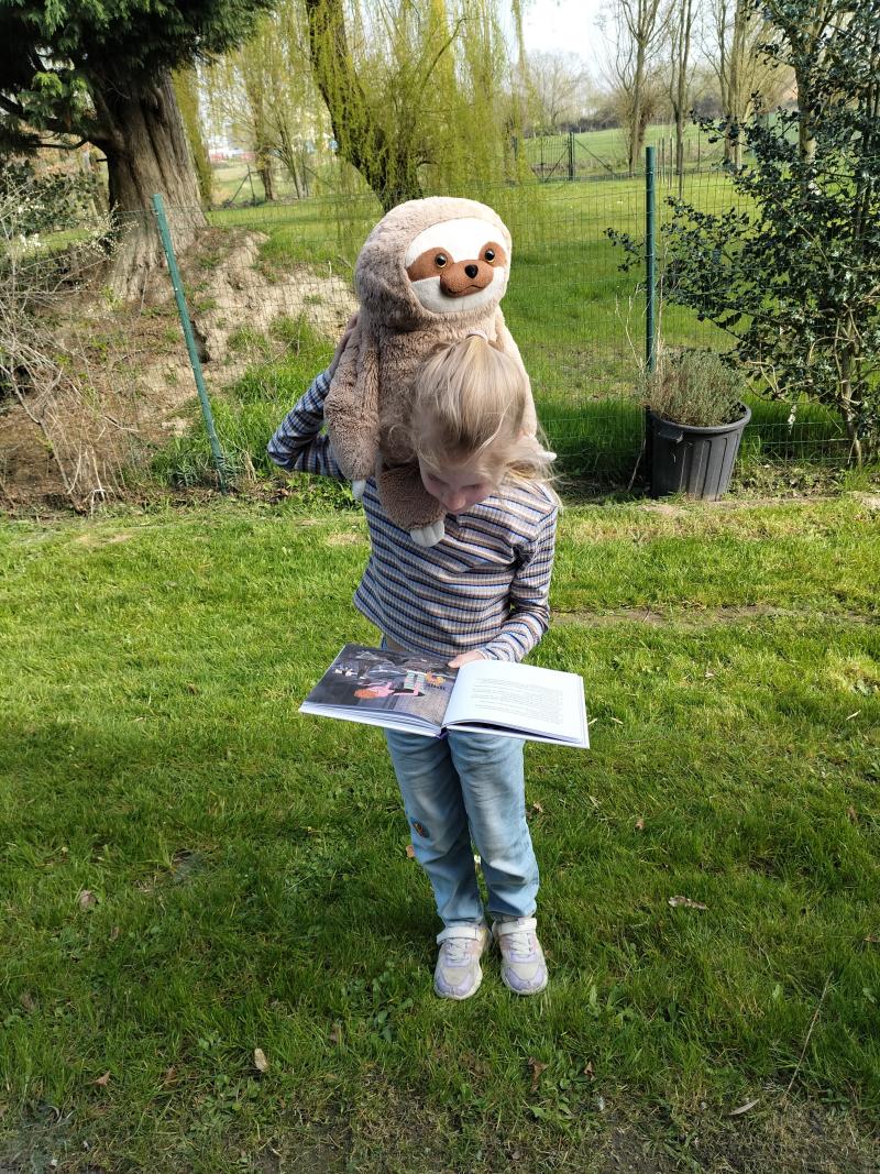 Nadat mama heeft voorgelezen, lees ik graag voor aan mijn vriend Dobby. Dit boek heeft enkel prenten, dus hier kijken we samen. Maar bij andere boeken kan ik het verhaal ook al goed navertellen. En enkele letter lees ik al zelf. Ik kan niet wachten om meer te kunnen lezen!